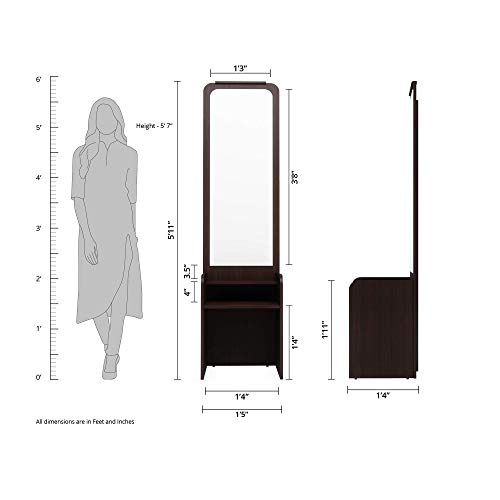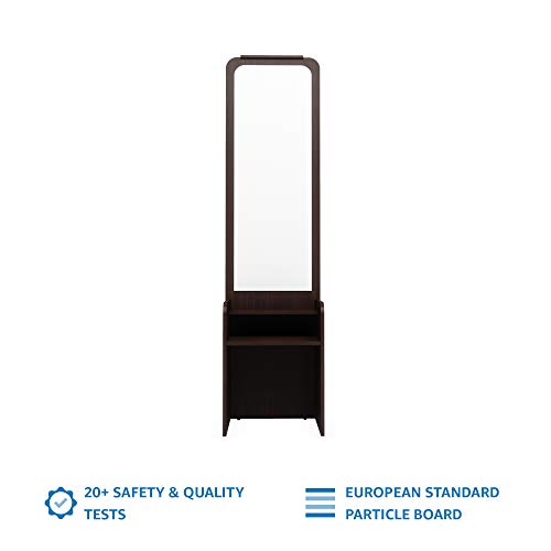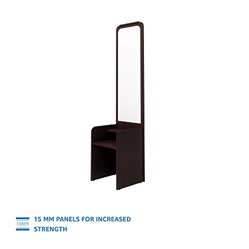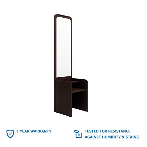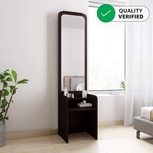 The Solimo Polaris Engineered Wood Dressing Table is elegantly designed with smooth, curvilinear edges and has a sleek imperial teak finish. Made using premium quality, engineering wood, the table undergoes multiple tests to ensure durability and safety. The table includes a long mirror to provide a full-body view while dressing and storage shelves for keeping toiletries and makeup. The table allows easy cleaning with its humidity, stains and hot-water resistant structure. It also saves space as you can easily store a stool in the hollow base without taking up extra floor area. Additionally, it is made without harmful chemicals or toxic substances, making it a safe addition to your dressing area. It also includes a 3-year warranty against manufacturing defects.