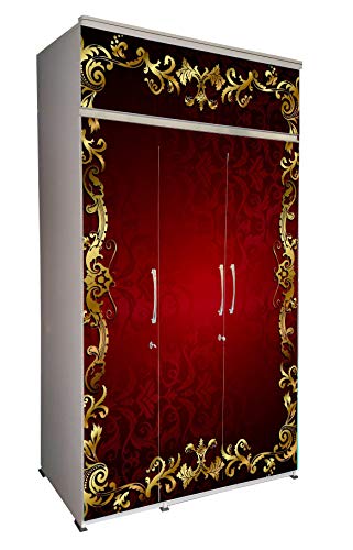 It is 3 door wardrobe with digital laminated graphic door panels with high gloss finish. Crafted from best quality pre-laminated particle board in white color. Gives you ample storage with hanger rails for hanging purpose and hydraulic storage at the top. Shelves in the side doors for storing all your belongings. Milky white inside for a decent finish. Designer clothes need a designer wardrobe.