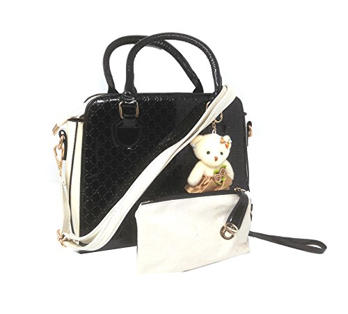 *Set of matching 2 bags (1 Satchel Handbag & 1 Wrist Pouch); 1 Detachable Leather Sling Strap, The Handbag also comes with Double Leather Handles, Tassel Teddy Bear Charm, Bottom Supporters, Zip Closure; Embossed Square Design