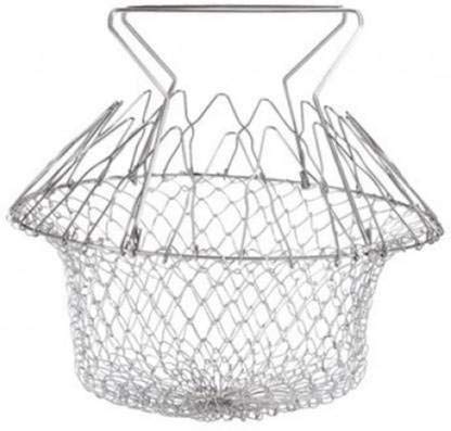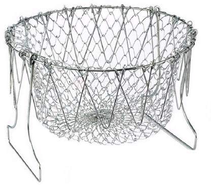 It instant Flexible essential kitchen helper. It starts off flat and instantly expands to a flexible basket that let you cook, boil, or deep fry foods with ease. Specially designed handles stay cool to the touch. When cooking is done, simply lift out the basket and go right from the pot to the plate. You can rise your food in the chef basket, lift handles back up and go right from the sink to the pot in one easy motion. It folds flat for easy storage anywhere. Material:Steel.