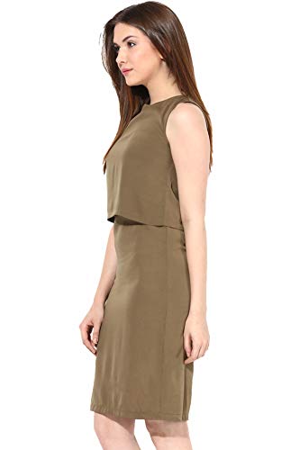 This relaxed fit mini layered solid mini dress, Has a round neck and is sleeveless, Has a zipper closure