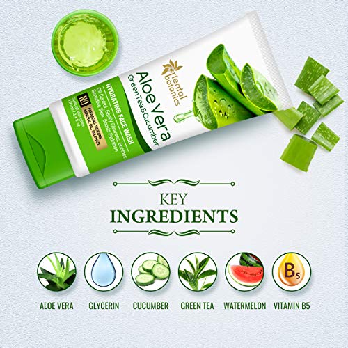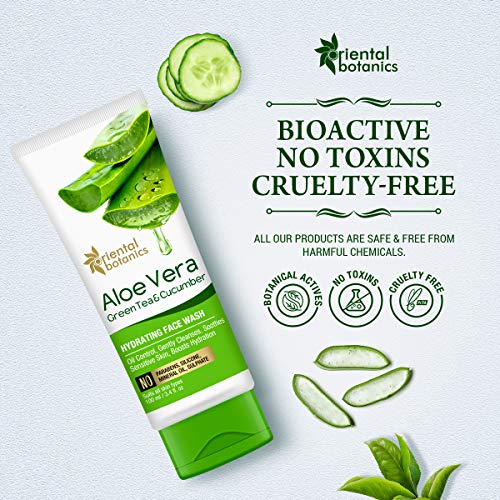 Oriental Botanics Aloe Vera, Green Tea & Cucumber Face Wash is an all-in-one face wash carefully created to rescue the skin from city pollution. Powered by the dual action of cleansing & nourishing, this face wash deeply purifies the skin and helps restore the healthy complexion. It is gentle on the skin and known for its deep- cleansing action. The creamy lather formed by the face wash dissolves dirt, grease, and toxins easily, making the skin clean and brightening the complexion. The bioactive compounds rich botanical extracts in the face wash help in diminishing imperfections caused by exposure to environmental pollutants. The hydration boosting effect of the face wash helps maintain the natural suppleness of the skin. The face wash restores the natural moisture mantle shielding the skin from pollution. This results in a squeaky clean skin that feels hydrated and looks bright & radiant. For best results, wash face at least twice a day & combine the Face Wash with other skincare products.