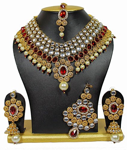 Shining Diva Non Precious Metal Traditional Kundan Jewellery Set, Necklace Set for Women with Earrings Maang Tikka and Passa (Red) (6849s)₹ 7,999.00