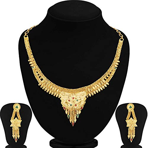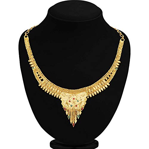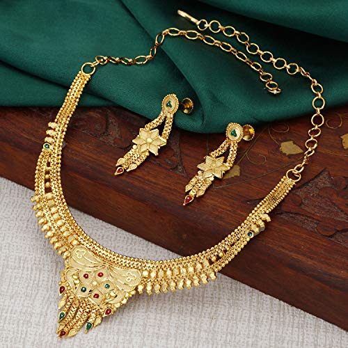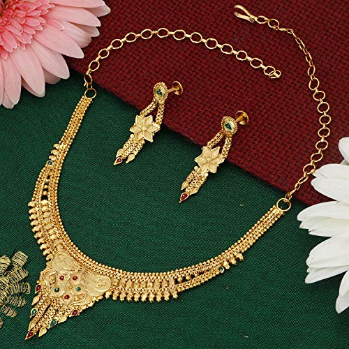 Traditional 24 Carat Gold Plated Choker Necklace Set for Women will complement any Indian attire. Women Love Jewelry as it not only enhances their beauty, but also gives them the social confidence. Make your moment memorable with this range. This jewel set features a unique one of a kind traditional embellish with antic finish. Earrings are very easy to use being lightweight and has a design which makes it very comfortable.