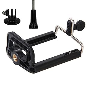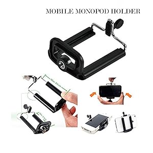 Mobile Holder, 1 x Monopod Tripod Mount Adapter, 1 x Long Screw for Gopro / Action Cameras, 1 x Camera Case Holder. Compatible with cell phone & Action Cameras. Black Phone holder that can be mounted on handheld self-portrait tripod, Action Cameras & selfie stick Color: Black Material: Aluminum alloy and plastic Size before expansion: 5.6 X 5.1 X 3.1 cm/ 2.2 X 2 X 1.2 inches Size after expansion: 8.4 X 5.1 X 3.1 cm/ 3.2 X 2 X 1.2 inches Compatible with 2.2-3.2 inch cameras or mobile phones or other device Capture photos or video above the crowds or in hard to reach places Hold your device firm Easy to install and use