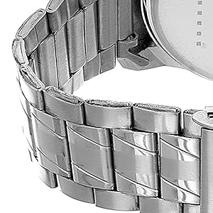 The band of this Timewear watch is made of a durable stainless steel material which flaunts a classy silver hue. The band sports an attractive brushed matte finish with a glossy patterned panel running along the middle.