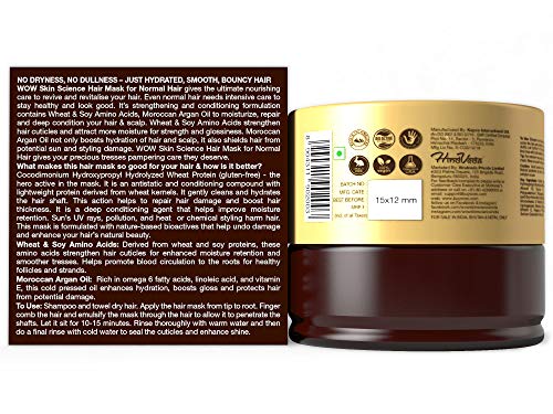 WOW Skin Science Hair Mask for Normal Hair gives the ultimate nourishing care to revive and revitalize tresses. Even normal hair needs intensive care to stay healthy and look good. The strengthening and conditioning formulation of this Hair Mask contains Hydrolyzed Wheat Protein, Wheat & Soy Amino Acids, and Moroccan Argan Oil to moisturize, repair and deep condition hair and scalp. Wheat & Soy Amino Acids strengthen hair cuticles and attract more moisture for strength and glossiness. Moroccan Argan Oil boosts hydration of hair and scalp. It also shields hair from potential sun and styling damage. Organic : Yes