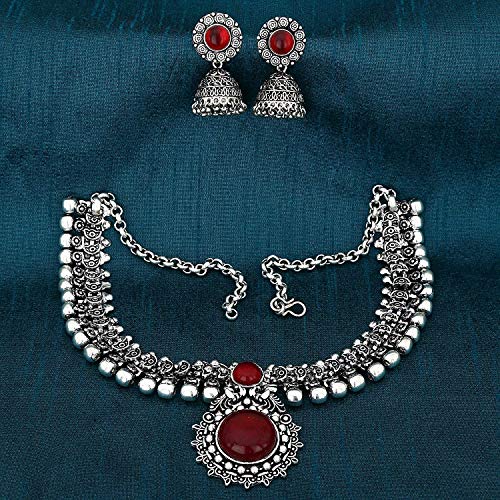 Yellow Chimes Exclusive Antique Design Vintage Oxidised Silver Kolhapuri Stone Choker Necklace Set with Jhumka Earrings for Women and Girls₹ 3,499.00